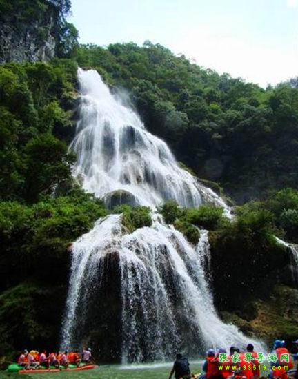 瀑布高200多米,上窄下寬,活似從天邊撒下的一具銀線網(wǎng)。是猛洞河最大的瀑布。它是一條水量豐富的小河,在此處突然失去河床的依托,水流飛奔直下,臨空跌落到底下的陡坡上,然后呈弧行展開,直飛到司河。此瀑布近觀滔滔、涸霧朦朧、凌空習(xí)墜、漫天飛珠,奔騰直下。流水傳說,這里原來沒有瀑布,只是一山石壁高聳藍(lán)天。壁下只有這具隋園形澄潭。古時(shí)候,潭中魚妖成群,作惡多端,其中一黑魚妖,每每掀翻船筏,攬人落水,以供餐食,據(jù)說在這里翻船破筏的人落水后沒有一個(gè)人能出來。人們苦叫這里為落水坑,年復(fù)一年,人們無奈,求上天保佑,于是玉皇派觀音下塵明查,查知黑魚作祟便揮手出線,招手成網(wǎng),一句咒語,黑魚妖落入網(wǎng)中,為了讓世人咄言黑魚,便將黑魚掛在石壁之上,遺臭萬年。觀音走后,魚網(wǎng)變成了這個(gè)大瀑,故名落水坑瀑布?,F(xiàn)遠(yuǎn)觀瀑布還可看到淹留在瀑內(nèi)的黑魚,隱隱約約在流水下閃動(dòng),那情景象是在緩緩向上游呢。