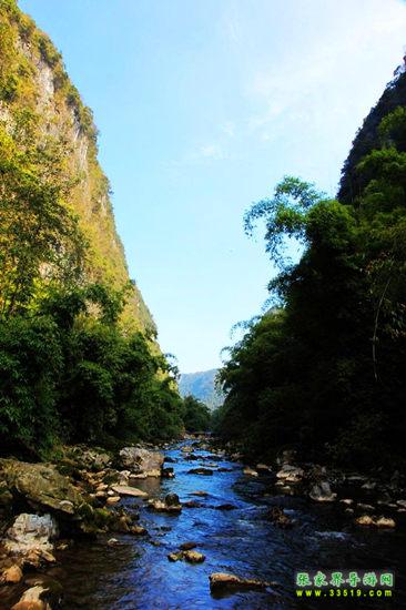 皮渡河沿岸修竹蒼翠,形成翠綠色的長廊,河水清澈透亮,象一條綠色鍛子串起無數(shù)明珠。峽谷中水與山親吻,形成靈動的水韻與雄渾的山巒,構成一幅山水長卷