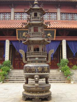 鹿苑早傳燈,信般若真如,華言妙諦,大千界恒河濁世,相期普證菩提,村化七家余,數(shù)桐葉為秋,幾歷罡風(fēng)消浩動;龍池今雨會,溯南湘佛地,無代禪宗,五百年滄海桑田,何幸一新蓮社,堂開三個(gè)后,看綠陰無恙,好憑香火結(jié)良緣。