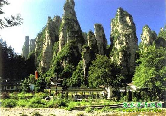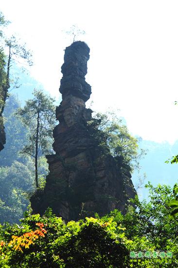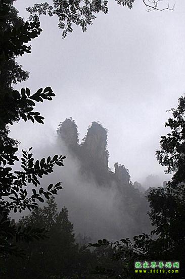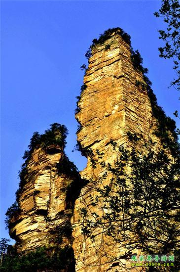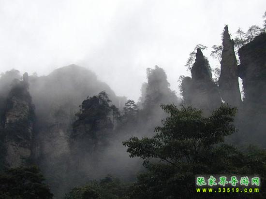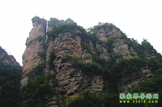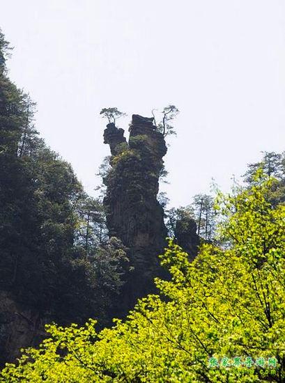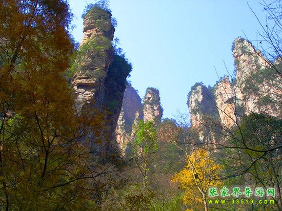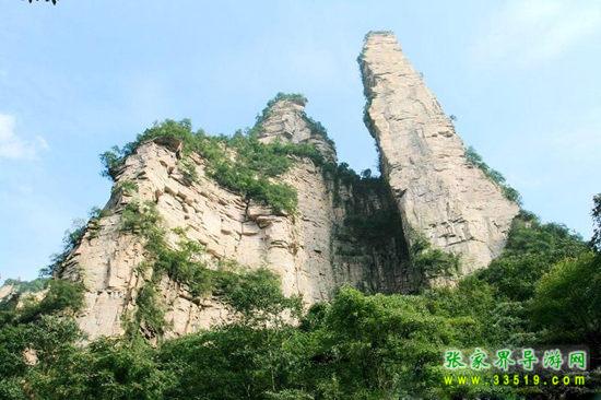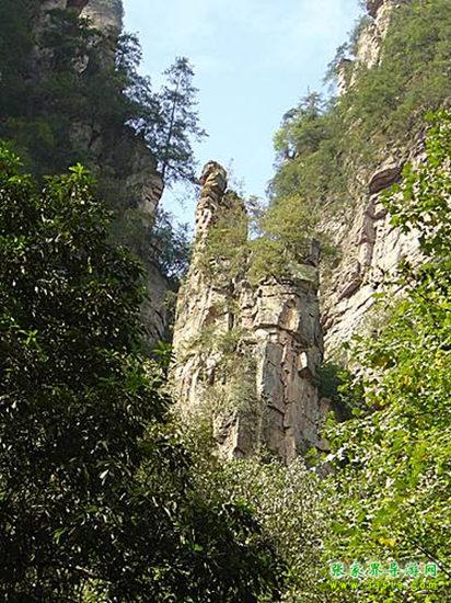 山谷中并排而立的三支山峰,有模有樣,有人叫他們“師徒取經(jīng)”,說那是唐僧、孫悟空、沙和尚三人的“合影”??催^《西游記》的朋友,可能對這片風景有似曾相識的感覺,這兒曾是中央電視臺拍攝《西游記》的外景地。有些客人經(jīng)常問,重要人物豬八戒先生怎么沒有趕上這個“合影”呢?他忙里偷閑,在后面背媳婦去了(我們剛才不是看過“豬八戒背媳婦”那個景點嗎?)不小心誤了時辰。如此看來,愛情和事業(yè)有時難免會有點矛盾。