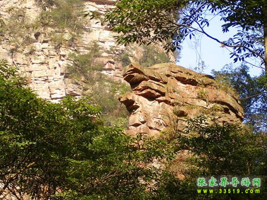 密林中有兩塊石頭,很像兩只龜重疊在一起,探頭探腦的樣子,正向著金鞭溪爬去。有人說這是“夫妻雙雙把家還”。這兒有一個荒誕的故事:億萬年前的一個晚上,海龍王通知居住在這一帶的蝦兵蟹將及所有手下,明天天一亮海水就要消退了,必須全部及時撤走。這兩只情龜只顧著花前月下,把海龍王的話當耳邊風,第二天早上起床,望著海水已經(jīng)遠遠地退去了,后悔莫及。他們爬呀爬,只希望有一天這溪水能把他們帶回大海。有的人有不同的“版本”:這兩只龜藏在這深山老林干什么呢?為了躲避“計劃生育”。張家界像烏龜?shù)?hellip;峰很多,那都是它們干的好事呀!