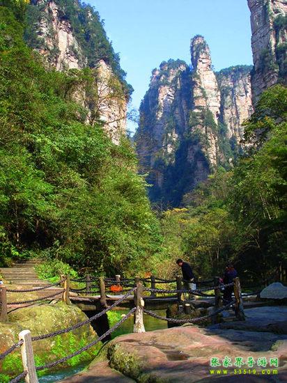 金鞭溪因流經(jīng)金鞭巖而得名,全長5700米,穿行於絕壁奇峰之間,溪谷有繁茂的植被,溪水四季清澈,被稱為“山水畫廊”、“人間仙境”。有詩贊曰:“清清流水青青山,山如畫屏人如仙,仙人若在畫中走,一步一望一重天”。途中你會看到點歌臺,那里有土家姑娘時刻準備為游人唱民族歌曲,只要付十元錢她們就會為你引吭高歌,當然,如果你不想花這個錢,也可以在一邊聽聽別人點的歌,聽完后走人。