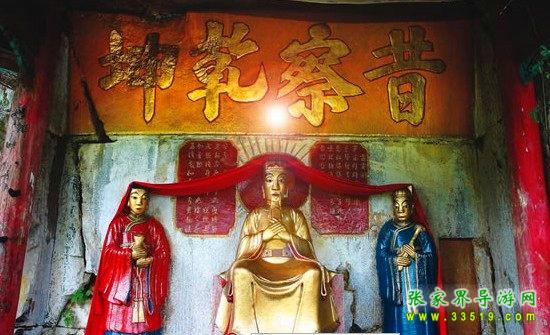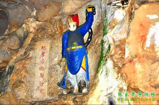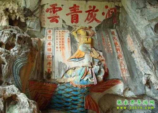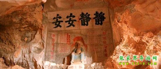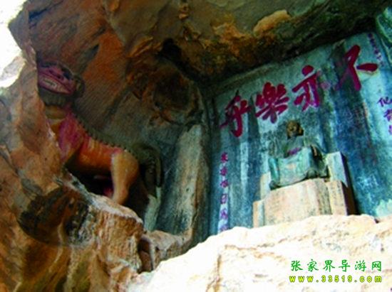 玉皇洞石窟位于張家界城西約7公里的麻空山南壁,為清代本地鄉(xiāng)紳李京開獨(dú)資捐修。李京開又叫李五瑞,別名九洞樂,號識破生。他生于乾隆七年(公元1742年),道光乙酉年(1825年)去世,享年83歲。李先生家道殷實,富甲一方。少時勤奮讀書,頗有才華,數(shù)十年奔波仕途,但屢試不第,官場無望,于是看破紅塵,另尋安慰,請工匠,耗巨資,憑借麻空山天然溶洞,按上、中、下方位布局,巧妙構(gòu)思,開鑿成“天堂”、“人間”、“地府”三層共八個洞。另外,在離此約3公里的峰泉洞另鑿一洞,故有“九洞樂”別名。玉皇洞石窟上層為玉皇洞,人間層有玉金洞、毫筆洞、墨池洞、虎龍洞、雄獅洞、孔圣洞,地府為因果洞,八洞組成一個完整的混沌世界。居八洞之首的玉皇洞,雕有玉皇大帝神像,意為“天堂”至尊,統(tǒng)帥中層的“人間”和下層的“地府”,故八洞統(tǒng)稱玉皇洞。此洞于1799年動工,到1807年完成,歷時八年。洞內(nèi)雕鑿了一些歷史人物的神像以及大量詩詞匾對,不僅石雕精湛獨(dú)特,雕像神韻生動,書法遒勁大氣,而且在石窟藝術(shù)的主題構(gòu)思上,抒發(fā)了主持捐修者李京開懷才不遇、憤世疾俗、向往太平盛世的情感,鞭達(dá)了腐朽的科舉制度,對于研究清代社會和科舉制度,以及當(dāng)時一般讀書人的思想情感,都具有一定的史料價值。整座洞窟東西長300余米,現(xiàn)存石像19尊,石刻50多處,是湖南省唯一保存完好的石窟藝術(shù)群,1959年玉皇洞被列入湖南省重點文物保護(hù)單位。