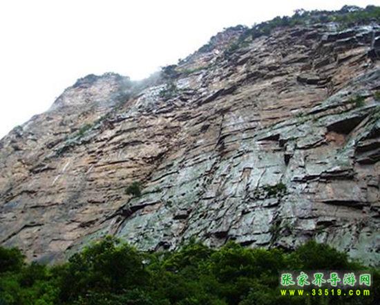 位于插旗峪正中右側(cè)。一石壁從溪邊橫空而起,頂天立地,高約300米,長約800米。仰望崖壁欲墜,通壁無掛,醫(yī)理清晰,棱角分明,強健雄渾,銳不可擋。壁前一谷攔泡,空靈清幽。又岸數(shù)峰相對,俯首揖拜。立于板栗山山頂繚望,此堅如一孺獸,昂首夾尾,豪氣奪人。