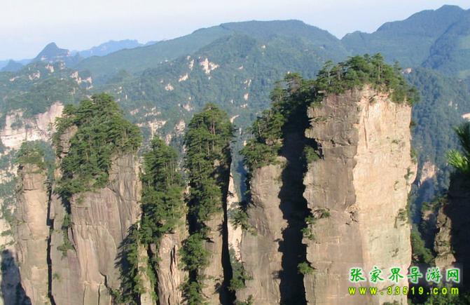 黃石寨西北崖沿下,6座高達(dá)200多米的橢圓形石柱,呈南北向一字排開在黃石寨與袁家界之間約2000米長(zhǎng)的溝谷中。石柱大小和間距相當(dāng),柱頂皆為平臺(tái),似一派待建橋面的橋墩。中間兩墩稍高,兩邊漸次降低。各柱頂可連成一條弧線,氣勢(shì)恢宏。橋墩下河床干涸,怪石嶙峋,樹木依稀,顯得古野、蒼涼。雨天,云霧滿壑,似一江怒濤,橋墩時(shí)隱時(shí)現(xiàn)。若逢東邊日出西邊雨時(shí),便有絢麗壯闊的彩虹南北飛架,與橋墩形成雙美合壁的奇觀。