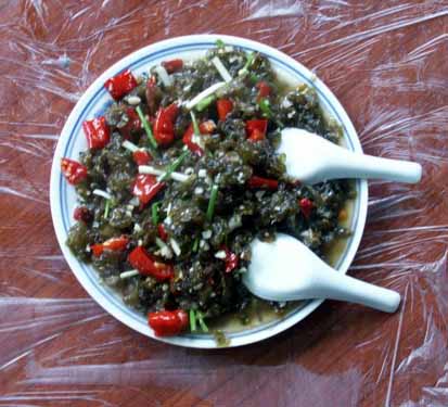 【 酸辣子炒沙蘿菇 】 當(dāng)?shù)卮合募居旰?,山頭巖石壁上生長(zhǎng)的墨綠色地菇——地衣(本地名為沙蘿菇),采集后用清水反復(fù)多沖洗幾次。再用壇子腌的酸辣椒和大蒜一起炒熟,出鍋后灑些許香蔥即成一道色、香、味俱全的地方特色小吃。