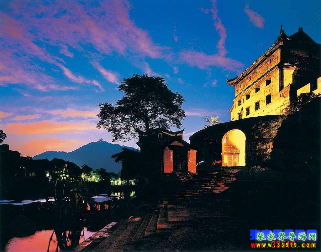 凰山城依偎著沱江,群山環(huán)抱,關(guān)隘雄奇。這里的山不高而秀麗,水不深而澄清,峰嶺相摩、河溪縈回,碧綠的江水從古老的城墻下蜿蜒而過(guò),翠綠的南華山麓倒映江心。江中漁舟游船數(shù)點(diǎn),山間暮鼓晨鐘兼鳴,河畔上的吊腳樓輕煙裊裊,可謂天人合一。