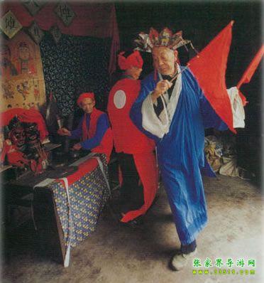 儺戲在湘西土家族地區(qū)也稱儺堂戲、儺神戲,它與土家族原始巫教、巫術的關系極為密切。土家族先民信奉的神有儺神、八部大神、土地神等,作為一種宗教活動,這種原始信仰與社會生產活動、文娛活動及民族習俗是融為一體的,因此儺戲最先的“沖儺還原”帶有明顯迷信色彩,土家族群眾中有“一儺沖百鬼,一愿了千神”的說法,湘西土家族人干脆叫它為“神戲”。湘西土家族儺戲的發(fā)展過程大體是儺、儺舞、儺儀然后才產生儺戲。儺舞源于久遠的蒙昧時期,土家先民們在同大自然作斗爭、同毒蟲猛獸作斗爭,便產生了化裝護面、在鼓樂聲中奔騰呼號、沖殺跳躍的原始儺舞,其所模擬的鳥雀舞、猿猴舞、熊舞等頗為壯觀。儺舞與儺這種驅鬼消災的祭祀儀式結合后,增加了祈求人獸平安、五谷豐登、緬懷祖先、勸人去惡從善、以及傳播生產知識等內容,這就逐漸形成了兼?zhèn)潢U弘教義及娛樂性質的祭祀風俗歌舞。[2]土家族儺戲就是在此基礎上發(fā)展起來的。部分土家族學者認為土家族儺戲的遠源可以追溯到戰(zhàn)國時代的《九歌》,《九歌》是土家族儺戲的雛形,他們的依據是當時楚國的沅湘流域,人們“信巫鬼、重淫祀”(《漢書·地理志》),從而使得“陰陽人鬼之間,又或不能無褻慢淫荒之雜”(宋代朱熹《楚辭集注》)。屈原正是加工整理了這一類“鄙陋”之詞,才創(chuàng)作出《九歌》、《天問》等名篇。也有部分學者不贊同這種論點,他們認為土家族儺在宋代還停留在儺祭和儺舞階段,最遲到明代,土家族儺才發(fā)展成為儺戲[3]。嘉靖《常德府志》記載:“歲除,歲將盡數日,鄉(xiāng)村多用巫師,朱裳鬼面,鑼鼓喧舞竟夜,名曰還儺。”文中未點明“儺戲”二字,但卻使用了“還儺”一詞,這與今天民間對儺戲的稱呼相似。又據清乾隆《永順縣志》載:“永俗酬神,必延辰郡巫師唱演儺戲,……至晚,演儺戲。敲鑼擊鼓,人各紙面一,有女裝者,曰孟姜女;男扮者,曰范七郎。”在土家族儺戲中,孟姜女傳說故事占著非常重要的地位。在湘西土家族地區(qū),儺戲一般有二十四正戲,即二十四戲神。每次儺儀結束時,巫師要用香火在黃裱紙上燒二十四個洞,以表示奠祭二十四戲神。民間有諺語:“儺神菩薩不識字,只要二十四個圈圈滿。”在二十四儺神中,被稱為勾愿神的姜女、范郎是還儺愿時非常重要的兩位神靈。在儺戲中,《孟姜女》是整場的高潮,平時,儺戲唱完后,由沒下裝的孟姜女、范郎去向主人家及觀眾“拜臺”,以示“了愿”。清代中期以后,儺戲吸取了花燈、陽戲、高腔等其他地方戲劇劇種的唱腔和劇目,逐漸變得日益成熟。我們仔細查看了全國371個劇種,發(fā)現儺戲、花燈戲有著相同的班社,也就是說一個演出班社可以演出儺戲、花燈戲兩個劇種。這段時期,儺戲已作為獨立戲劇劇種參加演出。由于儺戲是由巫儺法事演變而成的戲劇形式,經歷著巫儺法事(驅鬼祭祀)、儺壇上戲和儺堂正戲的發(fā)展過程。