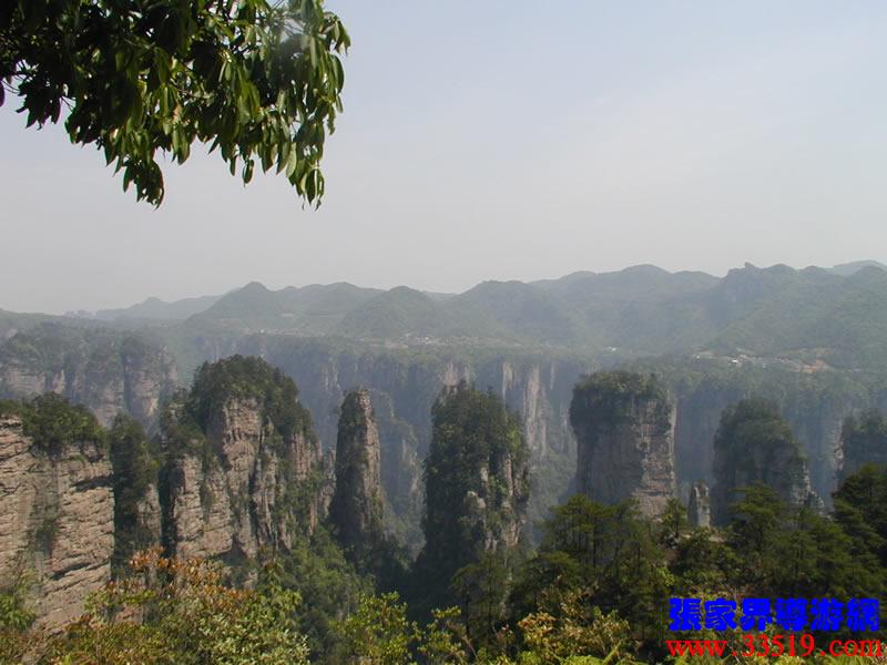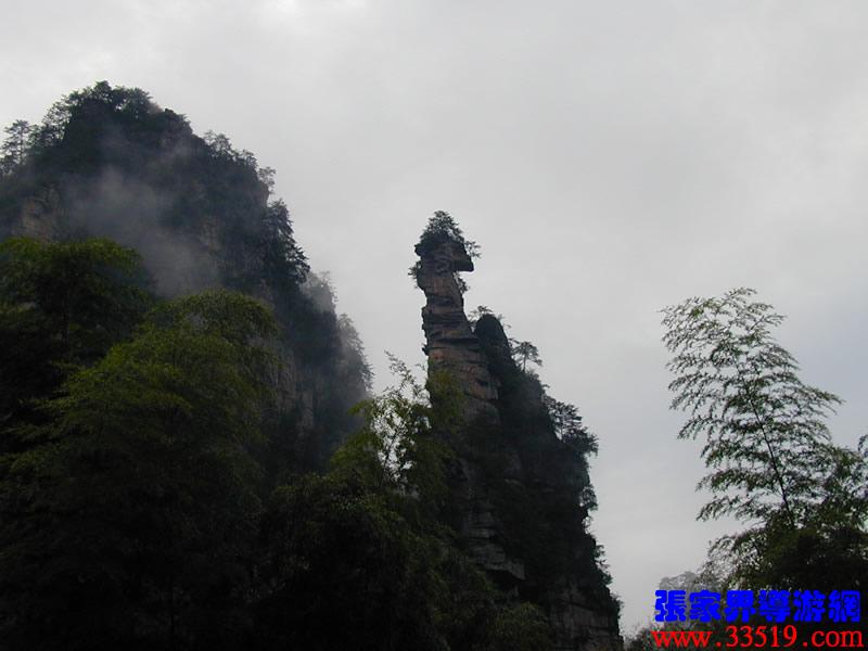 在整個(gè)武陵源風(fēng)景名勝區(qū),類似“天書寶匣”這種形態(tài)各一的景觀比比皆是。因此,您盡可以發(fā)揮各自的想像力,給它們?nèi)∫粋€(gè)有意思的名字。大家看,右前方那座高高的石峰,像不像掛著的一塊石碑?那就是龜精倉惶中丟下的天書,民間叫“天書高掛”,三個(gè)山峰之間正中的那個(gè)山峰,像不像只報(bào)曉的金雞?傳說龜精盜天書之時(shí),正趕上金雞報(bào)曉,故名金雞報(bào)曉。