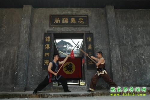 忠義鏢局,它始建于清乾隆四十二年(1777),位于洪江龍船沖,這里會館、錢莊、豪宅林立,堪稱洪江的曼哈頓。與我們在古商城看到的窨子屋不同,這是一座典型的北方四合院,前庭后院,布局嚴(yán)謹(jǐn),軸線明確,左右對稱,主次分明。前院是鏢師練功習(xí)武之地,墻壁上書有“忠”、“孝”、“禮”、“義”四字和“十八羅漢練功圖”;后院為鏢師起居和洽談生意之所,內(nèi)供奉關(guān)武大帝。忠義鏢局主要為豪商巨賈押運(yùn)銀票、貨物,看家護(hù)院,坐夜守店,也開館收徒,傳授武藝。忠義鏢局的掌門人劉大鵬,湖南長沙人,幼時(shí)即入嵩山少林寺習(xí)武,不僅精通十八般武藝,而且頭腦精明,他把鏢局開在這洪江最繁華的金融一條街,足見他的經(jīng)商意識和人面廣了?,F(xiàn)在忠義鏢局現(xiàn)場表演古代押鏢、行鏢全過程,是人們了解中國古代鏢行歷史文化的活性博物館。有興趣的朋友可以去洪江古商城親自感受一下當(dāng)時(shí)押鏢的情景吧。