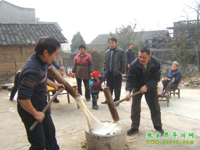 土家人民素有“二十八,打粑粑”的說法。每逢春節(jié)來臨,農(nóng)歷臘月末,家家都要打糯米糍粑,所謂打糯米糍粑,據(jù)當(dāng)?shù)剜l(xiāng)土志書記載:“系糯米飯就石槽中杵如泥,壓成團形,形如滿月。大者直徑約尺5,尋常者約4寸許,3至8分厚不等。”打糯米糍粑是一項勞動強度較大的體力活,一般都是后生男子漢打,兩個人對站,先揉后打,即使冰雪天也要出一身汗。做粑粑也很講究,手粘蜂臘或茶油,先出砣,后用手或木板壓,要做得玉圓光滑,講究美觀。