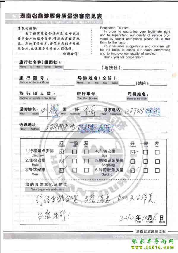 2010年10月6日劉先生一行6位旅游質(zhì)量反饋:行程安排合理,餐宿滿(mǎn)意,不虛此行