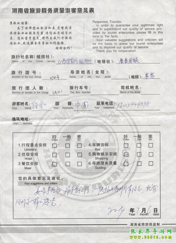 2009年7月6日山西白女士一行12人接待質量反饋單:
