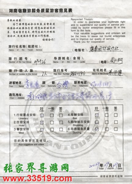 9月26日臺灣李先生一行7人接待質(zhì)量反饋單:
