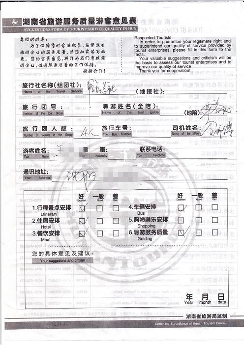 2011年3月27號(hào)王先生一行4人旅游質(zhì)量意見反饋