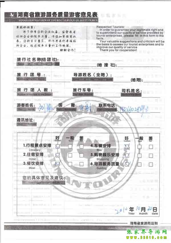 2010年10月30日劉先生一行6位旅游質(zhì)量反饋