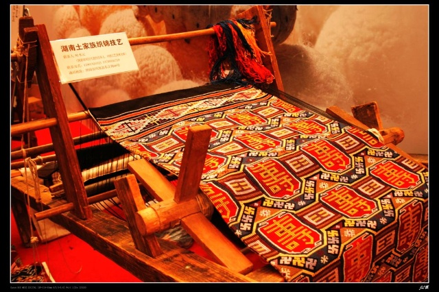 土家錦的織造方式,歷代沿用自漢代以來的腰機(jī)式斜織機(jī)。民間織機(jī)一般長約5尺,寬約2尺多,高約3尺。所用材料,為蠶絲或棉線,用棉葉、棉梗、茜草、土靛、紫莓、土紅、黃珠子等物染色。